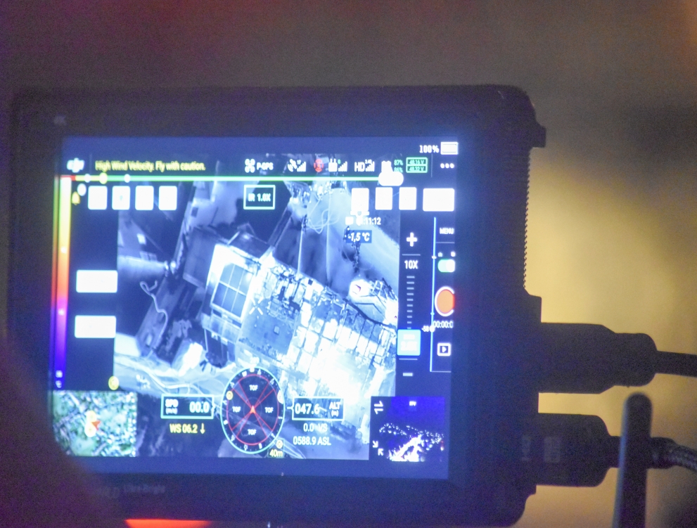 Nach der Inbetriebnahme des Drohnen-Equipments und einer Rücksprache mit der Einsatzleitung wurde der erste Erkundungsflug durchgeführt. Die Live-Bilder der Drohnen-Kamera zur Einsatzstelle wurden der Einsatzleitung für Lagebesprechungen auf einem 55" Großbildmonitor zur Verfügung gestellt. Später wurde ein weiterer Drohnen-Flug durchgeführt, nun konnte mit der Wärmebildkamera der Drohne auch aus der Luft nach Glutnestern gesucht werden.